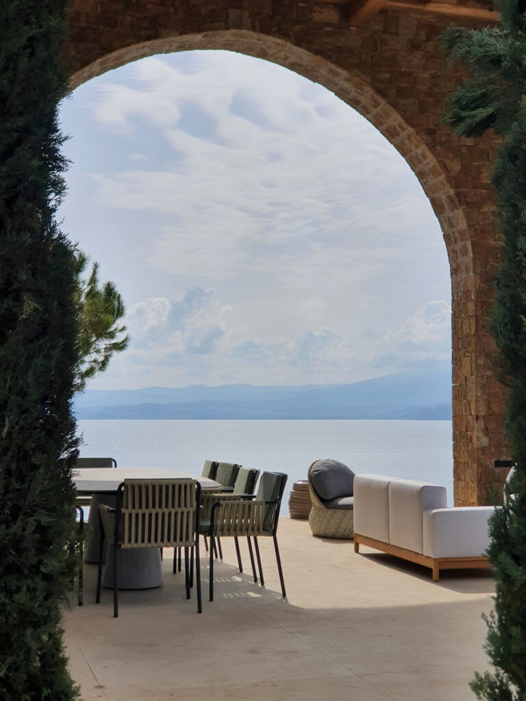 ADAMA sea resort has four fully autonomous villas of 250 sq.m. each. Each villa is equipped with its own kitchen and living room and has three double bedrooms with their own bathroom each. The master bedroom is located on the second floor and has panoramic sea view. The view can be enjoyed also from the private courtyard of 60 sq.m. of each villa which is surrounded by the iconic stone arches that characterize the complex. The villas overlook the sea and are a breath away from the pool where the guest has direct access.